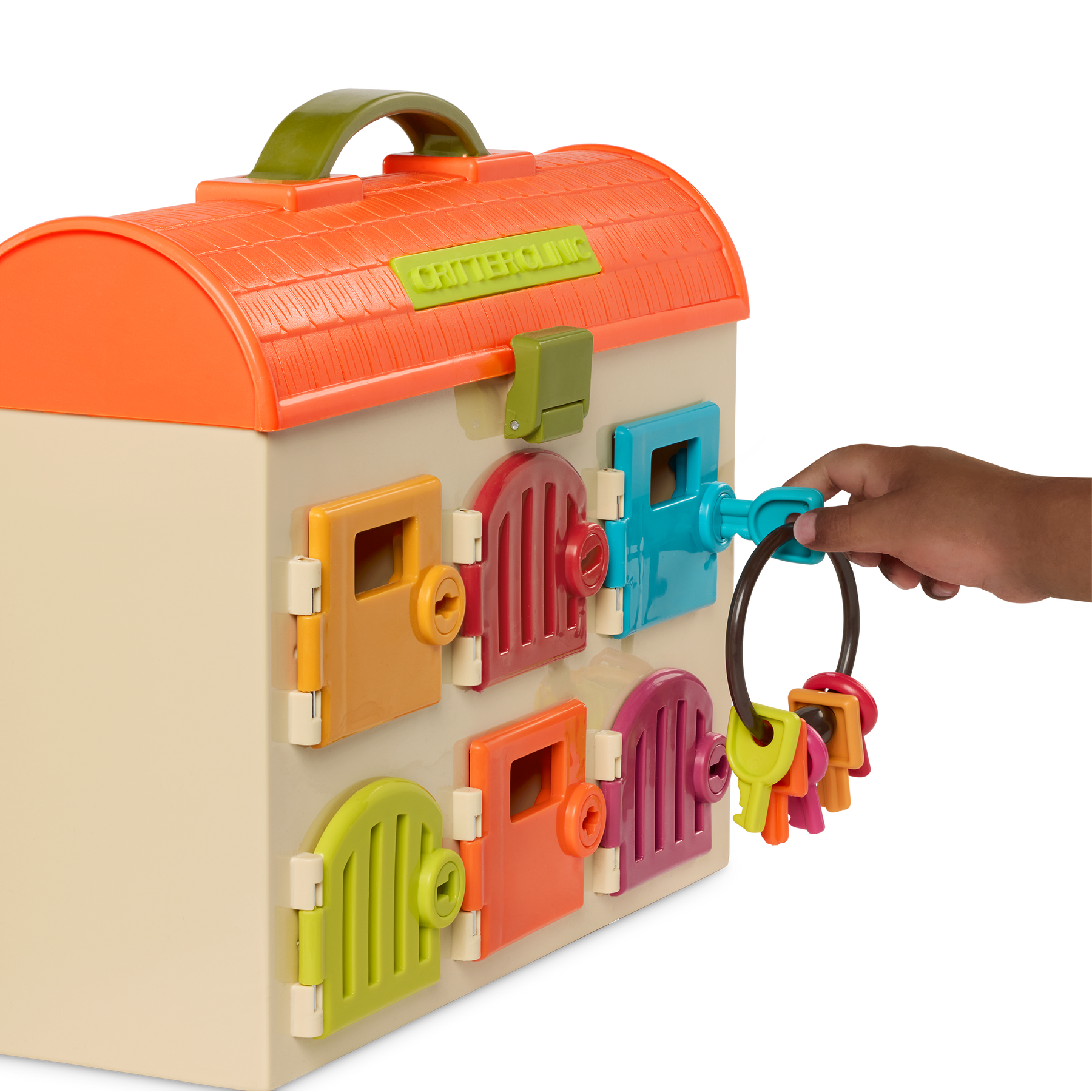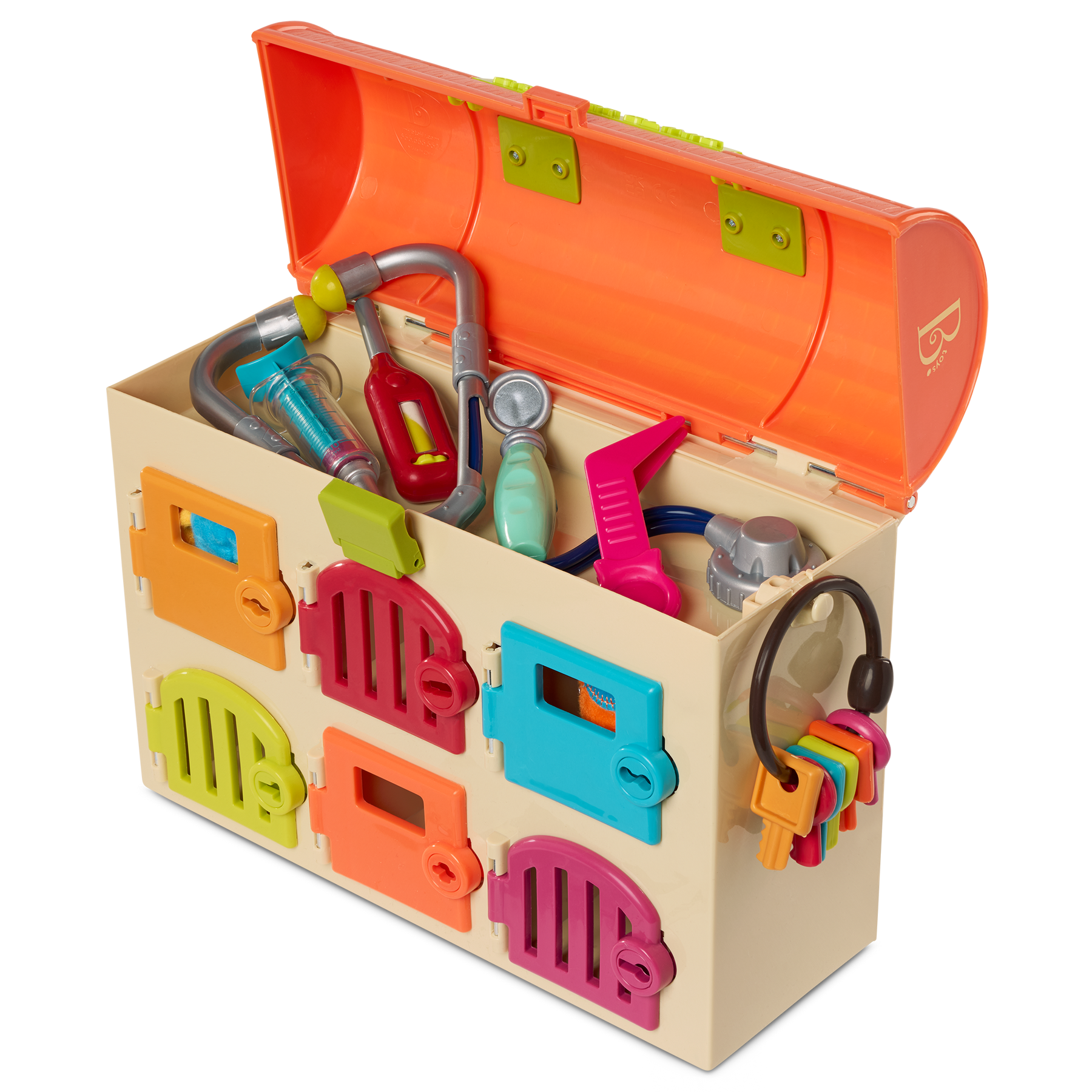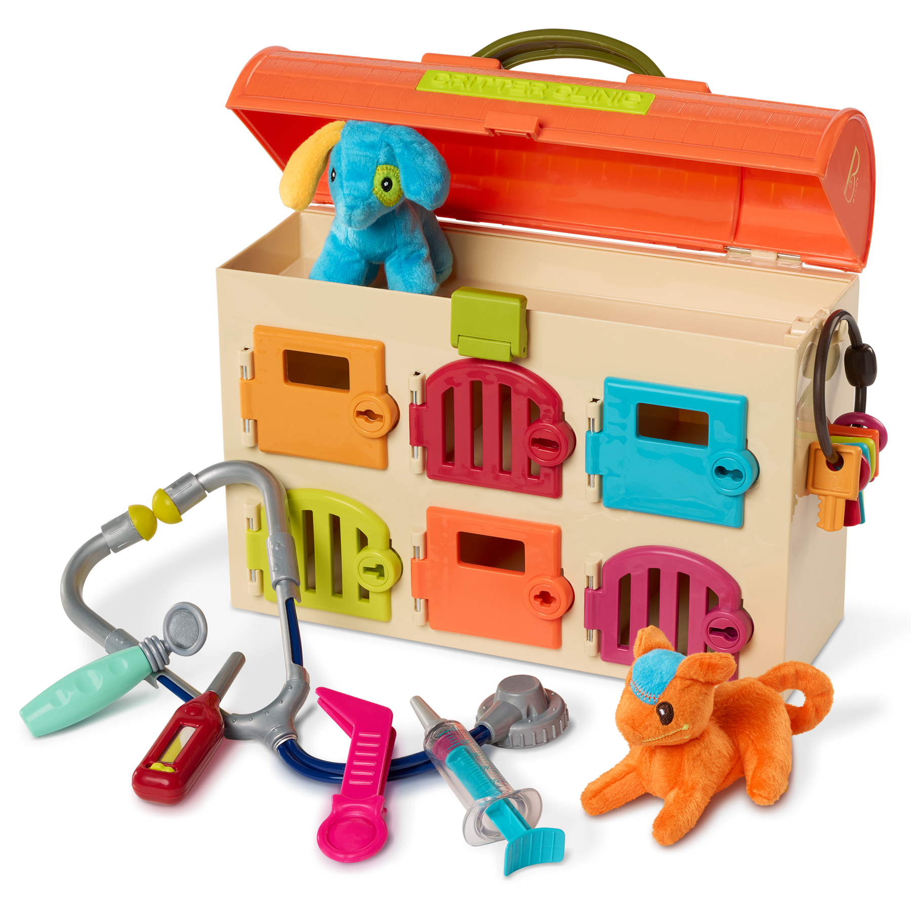 Keep kids busy for 9 lives or 7 dog years with the Critter Clinic from B. toys! This colorful animal hospital comes with 6 private rooms and 6 matching keys. Your vet in the making can play a color matching game, then treat a kitten or puppy with 5 kid-friendly tools – a stethoscope, mirror, syringe, tweezers and a thermometer. Not to mention, this vet kit doubles as storage and is easily portable, thanks to the handy handle on the roof! Playing pretend and caring for these plush patients can also develop a child’s sense of empathy and teach them about the importance of care. And because we at B. keep the environment in mind, parents will be happy to know that our packaging is 100% recyclable!