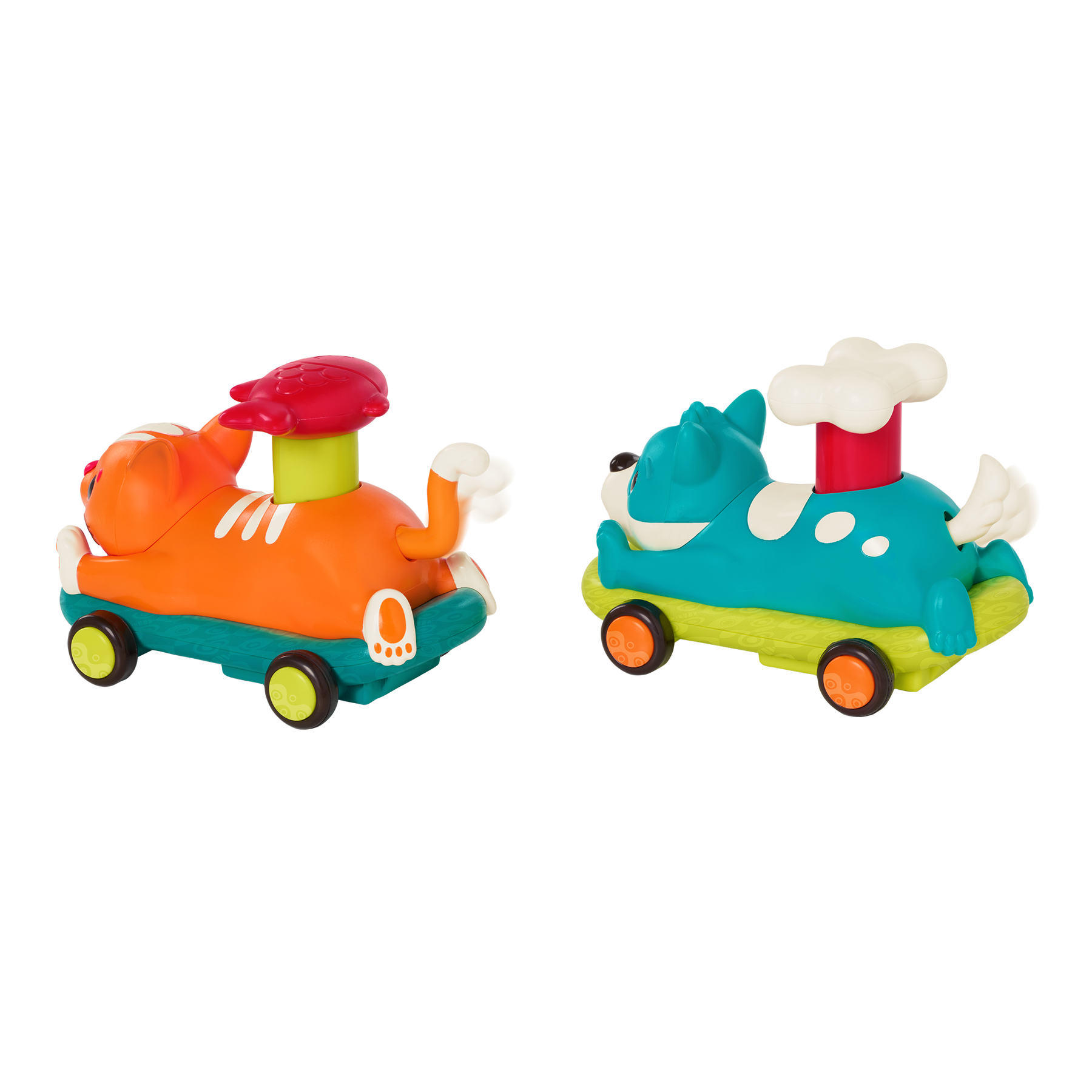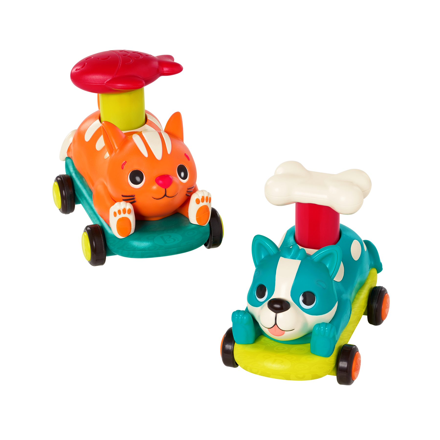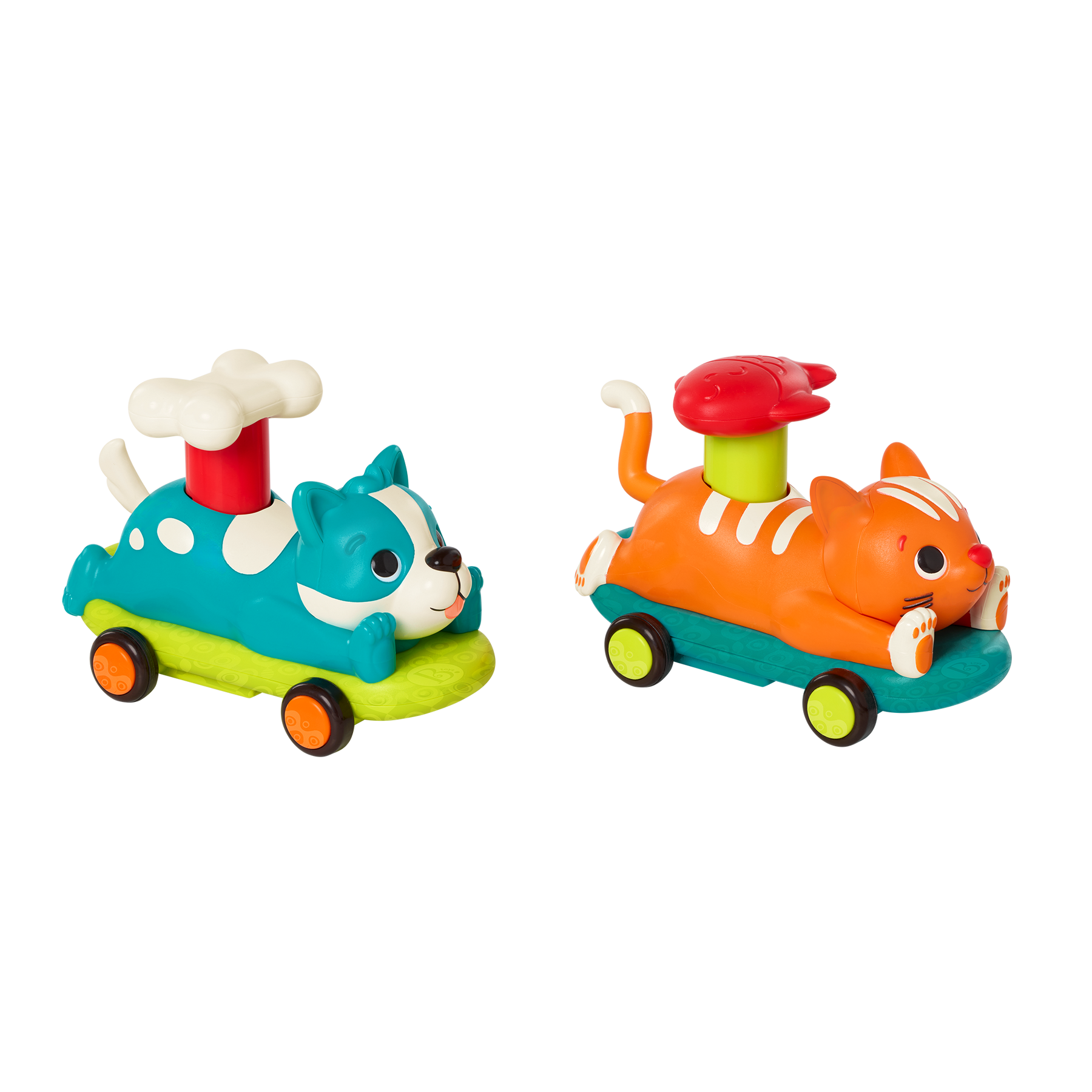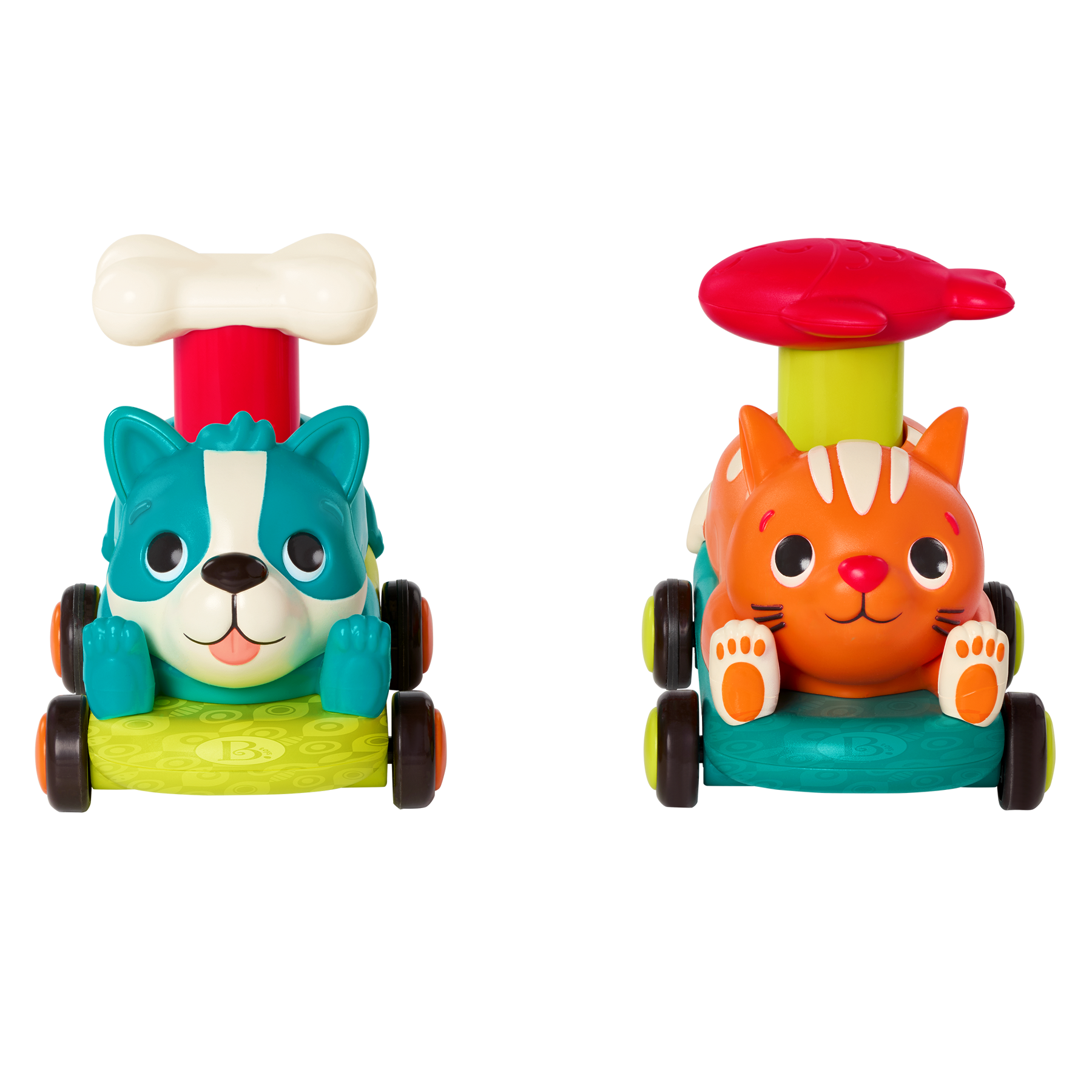 Take a ride with a pair of push-and-go pets using PawMobiles from B. toys! Grab hold of this dog and cat duo and roll into playtime for imaginative adventures or exciting races. These kid-powered toy cars zoom along with just a push – no batteries required! All kids need to do is press down on the bone or fish on the dog and cat to send the cars racing toward a great time. Playing with these toys is an excellent way to promote hand-eye coordination and introduce children to cause-and-effect. These PawMobiles are sure to become playtime's best friends! Recommended for children 18 months and older.