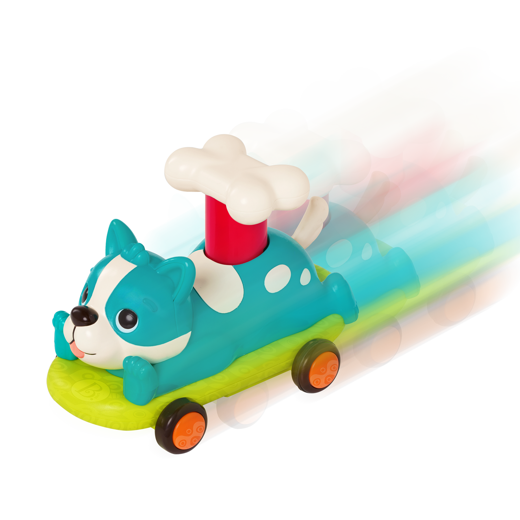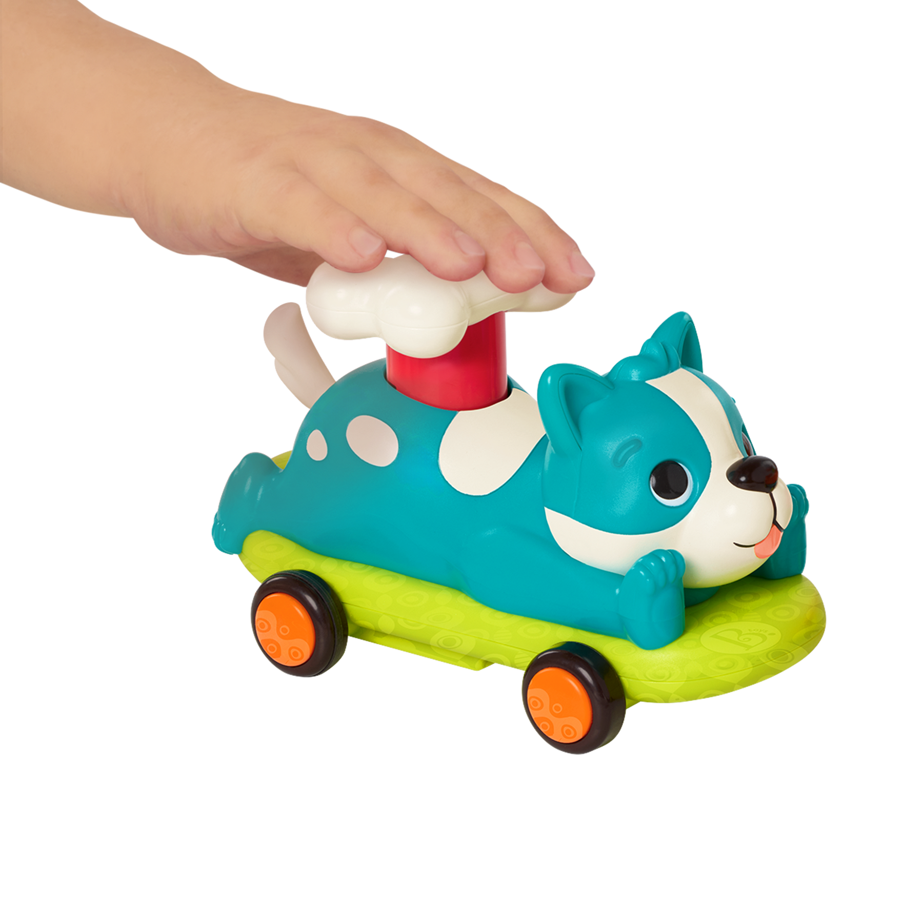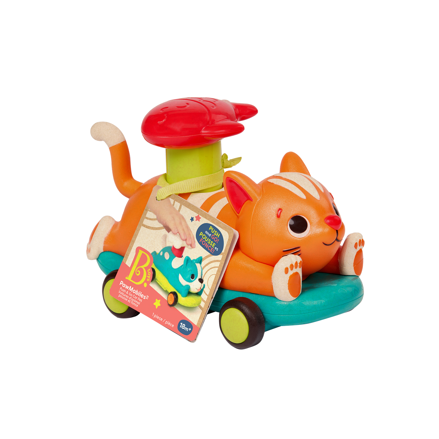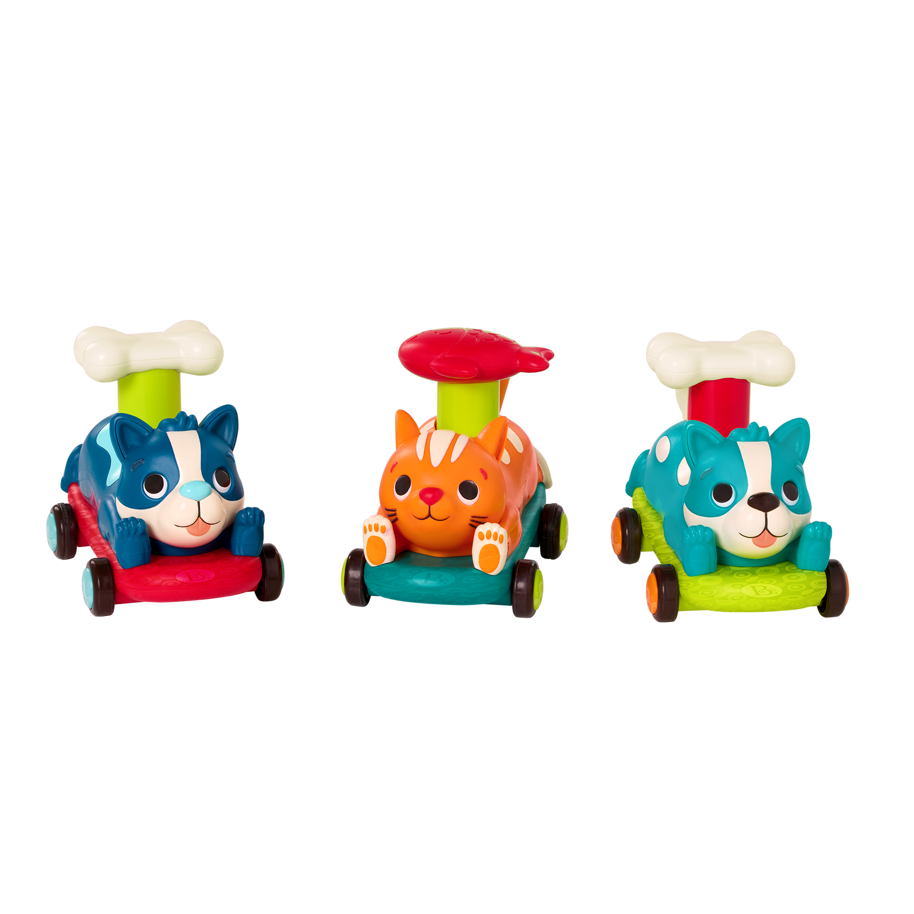 Take a ride with a pair of push-and-go pets using PawMobiles from B. toys! Grab hold of this dog and cat duo and roll into playtime for imaginative adventures or exciting races. These kid-powered toy cars zoom along with just a push – no batteries required! All kids need to do is press down on the bone or fish on the dog and cat to send the cars racing toward a great time. Playing with these toys is an excellent way to promote hand-eye coordination and introduce children to cause-and-effect. These PawMobiles are sure to become playtime's best friends! Recommended for children 18 months and older.