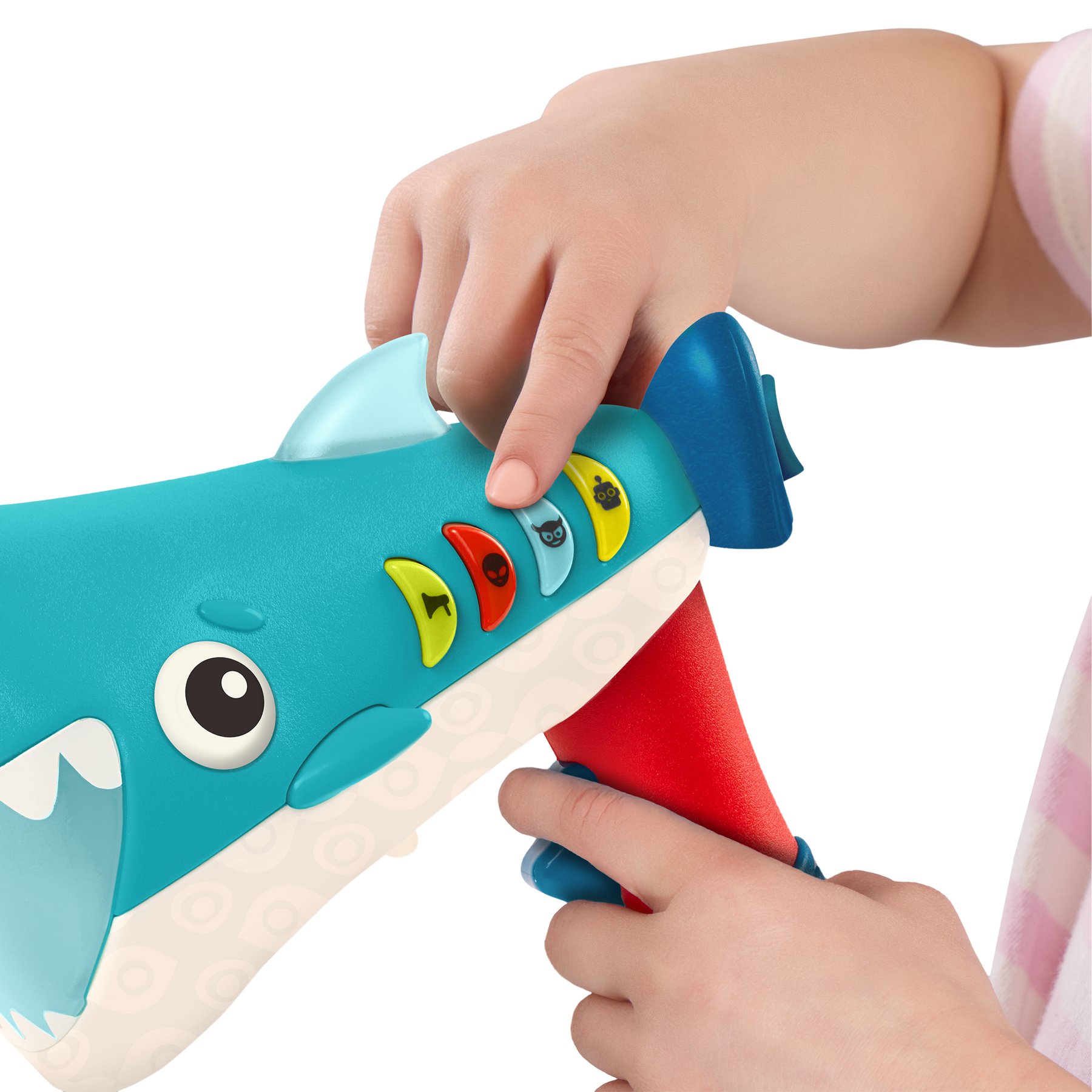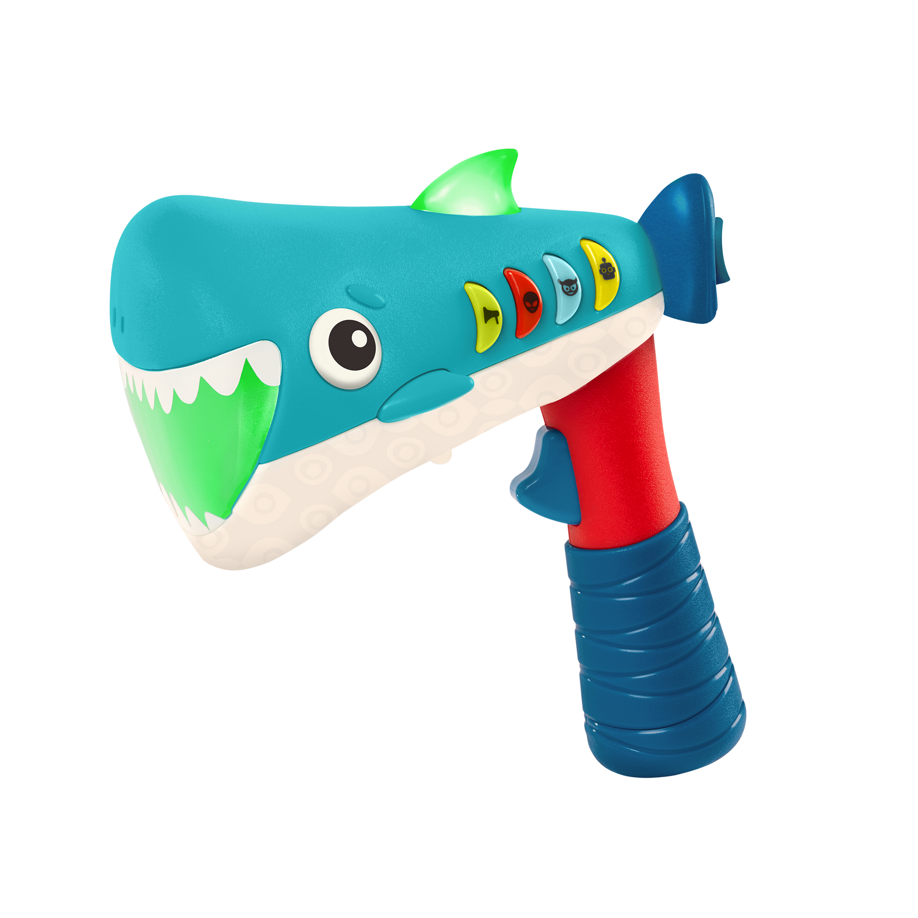 Turn up the fun and get whacky with the Silly Speaker from B. toys! This handheld voice changer toy packs a lot into a small package. Kids can transform their voice into a Robot, Monster, or Alien with the click of button—or get a lil' loud with the Megaphone setting! But that's not all. Click the Monster, Alien, and Robot buttons again to change the pitch for a total 7 exciting voice-changing combinations! Once kids pick their character they hold down the trigger and speak into the megaphone, and playtime gets a silly boost. This voice-changing megaphone is great for pretend play, puppet theaters, screen-free car rides, or just being silly! Did we mention it lights up? That's right, the lil' shark fin and mouth glow as kids act out their imaginary masterpieces. 3 AAA batteries are required and included. Recommended for children 5 years old and over.