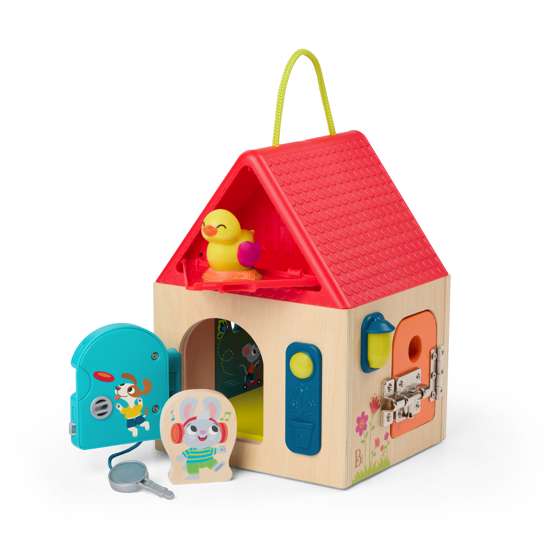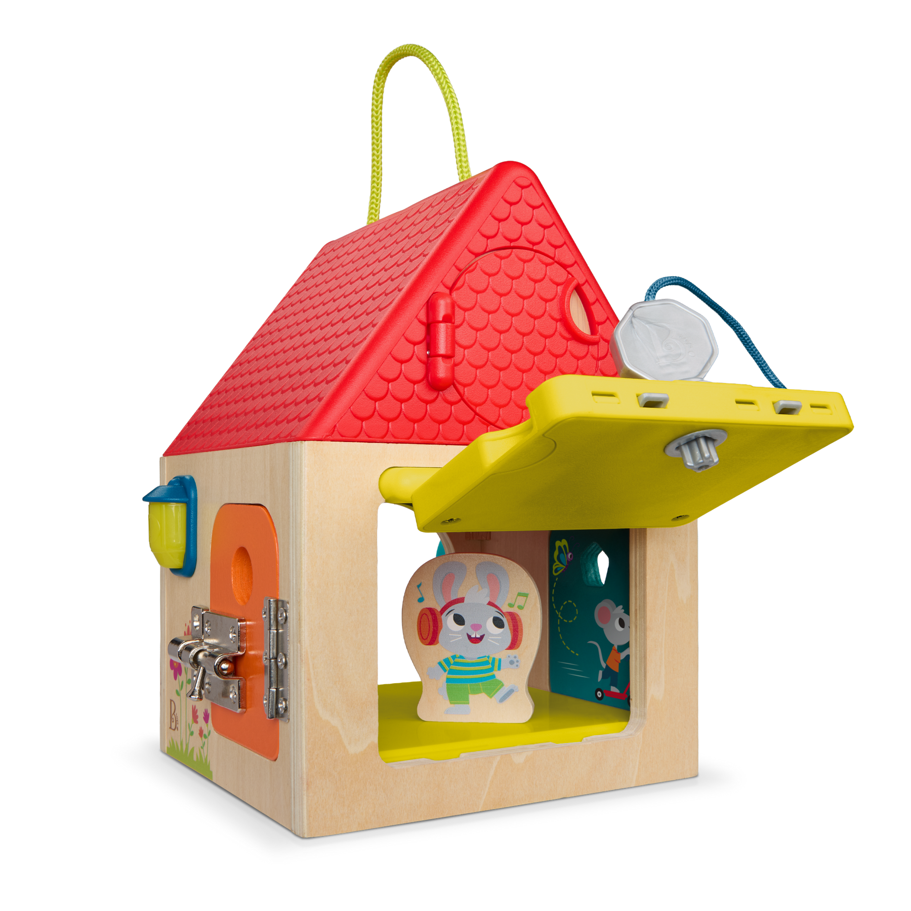 Discover more behind every door with the Unlock & Learn Box from B. toys! This sturdy wooden lock box toy is also a friendly neighborhood house with lots of nooks and crannies to explore. Start with the two hardware latches, one bar and one chain, and peek inside the house to meet a friendly bunny. Don't forget to ring the bell! Kids can also turn on the porch light before moving on. Ok, ok, now it's time for the keys. Unlock the doors with the two keys and turn 'em to get inside – kids will discover a rotating weather carousel on the garage and a fun illustration inside the door! Next up is the windows. Pop 'em open to find a lil' cuckoo bird and other surprises! This dexterity lock box is great for improving kids' problem-solving skills and improving fine motor function. Batteries (2xAAA) are required and included. Recommended for kids 3 years and over.