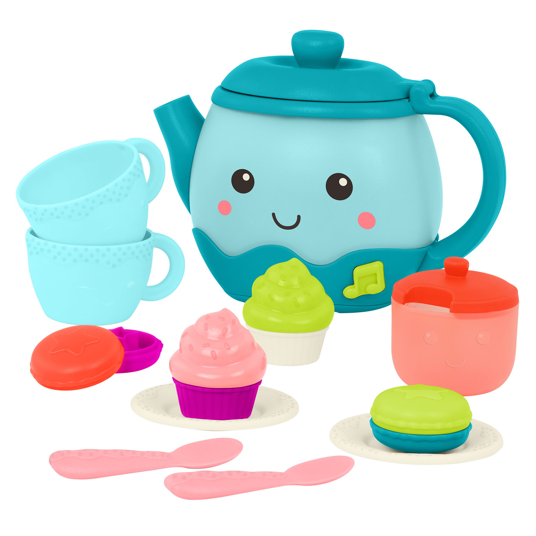 Get ready to pour a cup of fun with the Musical Tea Party set from B. play! This musical tea set comes with a light-up teapot that plays songs and makes realistic pouring sounds. And with the included accessories, it's sure to be a real party! Kids can serve up tea in two cups and ask whether it will be one lump of sugar – or three! After filling the cups, kids can use their sorting skills to match the pieces of the macarons and cupcakes together for a tasty treat. As they play, toddlers will also be exercising their fine motor skills and building important social skills. 3 AAA batteries required and included. Recommended for kids 18 months and over.
