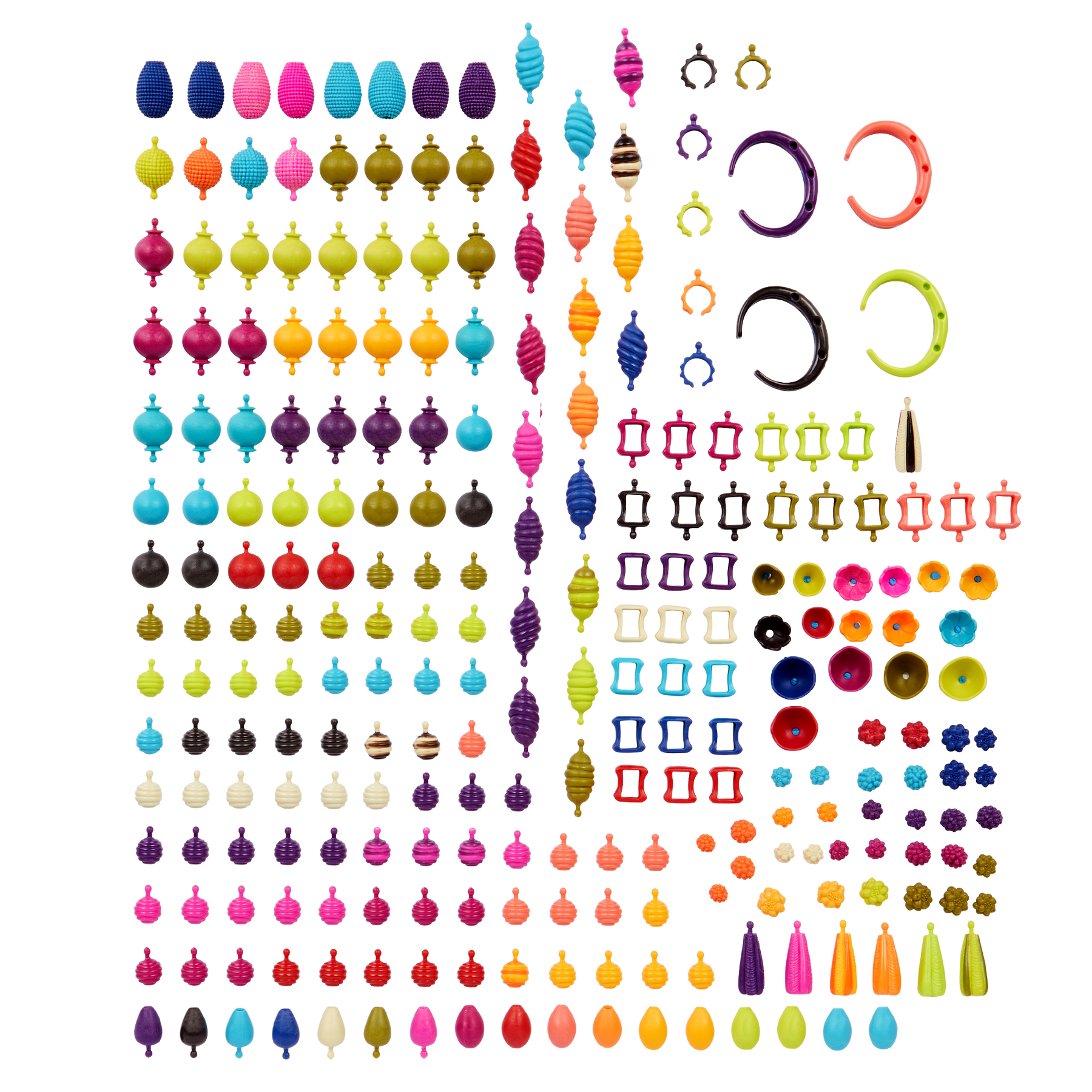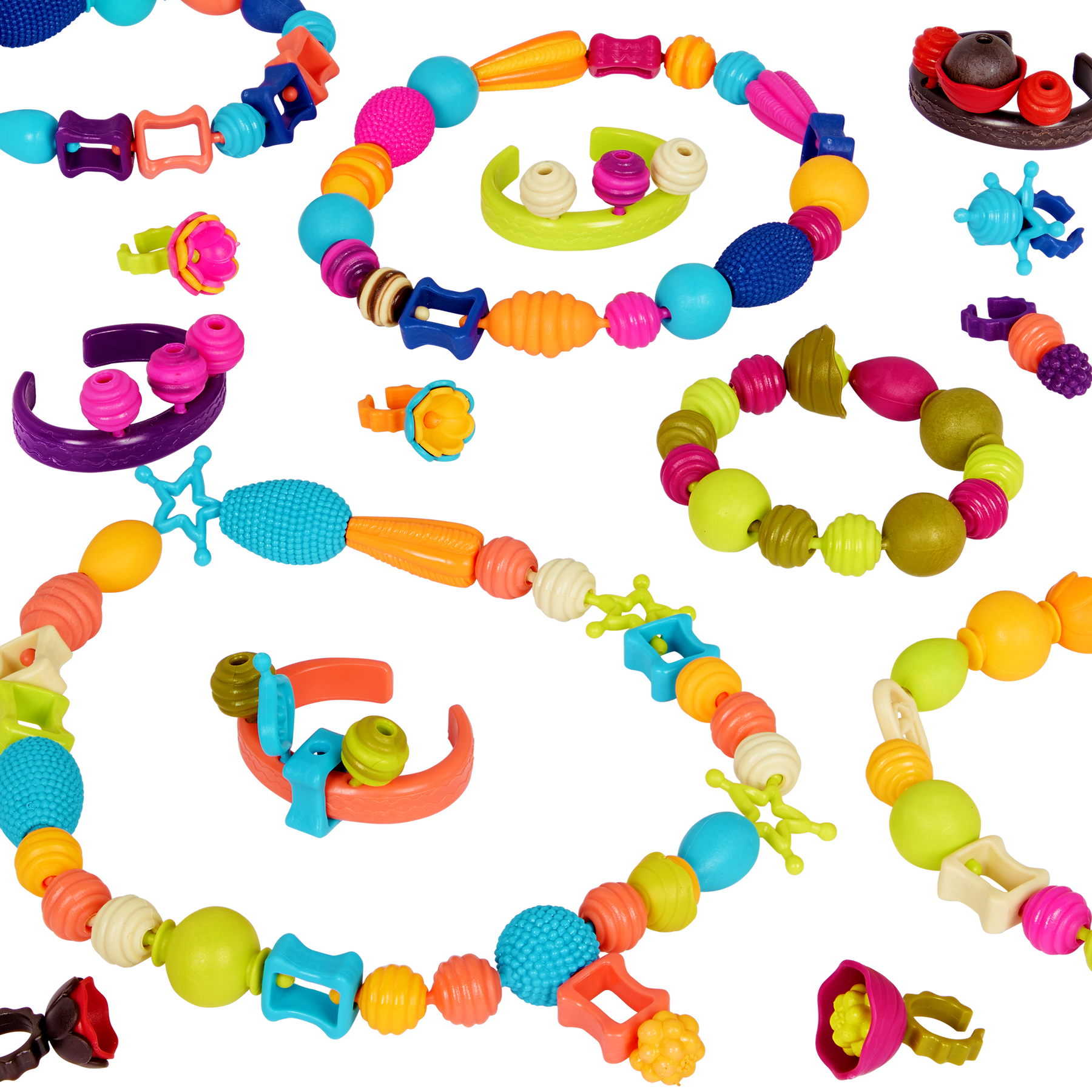 Pop! Pop! Pop! Just try and stop! The B.eauty Pops jewelry making set from B. toys comes with 275 pieces that feature a variety of colors, shapes, and textures. Mix and match to create a ton of B.eautiful necklaces, bracelets, and rings – the combinations are endless! All of the reusable beads snap together simply, quickly, and safely. Your little jewelry maker can spend hours designing unique pieces for the whole family, then pop 'em apart and start all over again. Not to mention, cleaning up and traveling is hassle-free – just store all of the beads in the handy jar and carry it with the help of the handle. And because we at B. keep the environment in mind, parents will also be happy to know that our packaging is 100% recyclable. Recommended for kids 4 years and over.